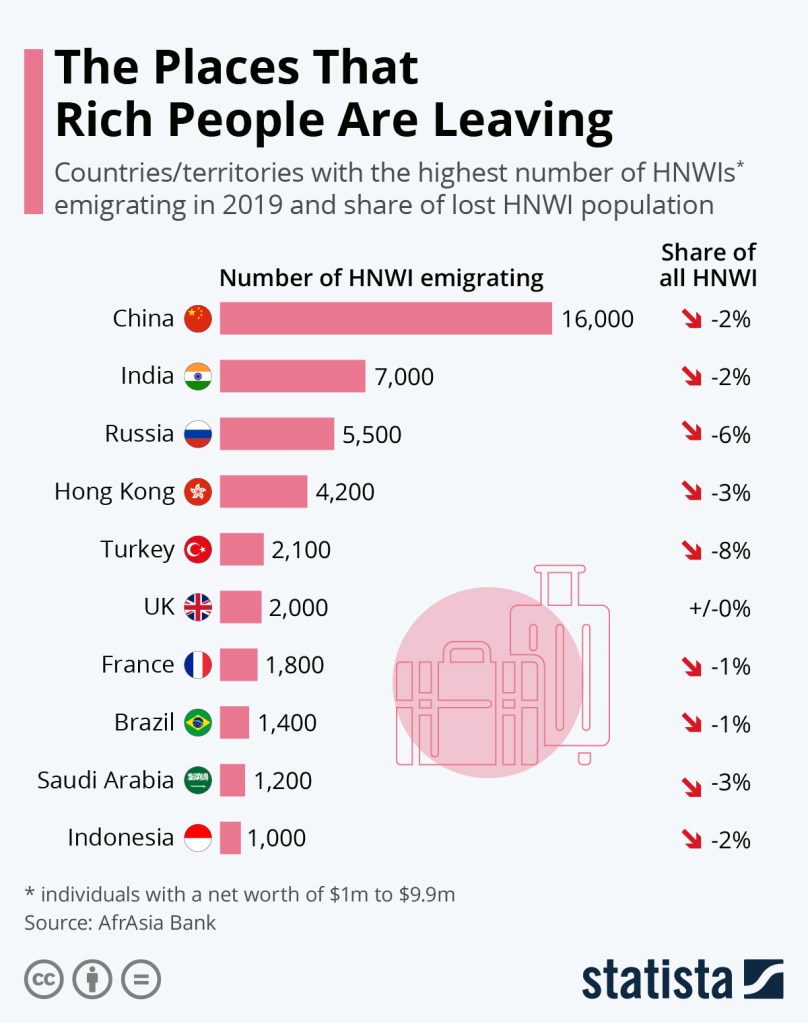 El otro día encontré en Twitter un post que lo explicaba de una manera bastante sencilla (lamentablemente parece que lo eliminaron ya que no encuentro el tweet). La riqueza de China está concentrada en un número selecto de personas. Éstas son personas que tienen cantidades gigantescas de dinero, son personas con más riqueza de la que nos podemos imaginar y que la mayoría de las veces nunca escuchamos de ellos. Puedes pensar que estas personas tienen en sus closets ropa Gucci, Chanel, Hermes o el último reloj de Rolex pero no, estas personas tienen en sus closets dinero; gigantescas cantidades de efectivo. Y lo que hace diferente a este grupo de personas muy adineradas en China de otras personas que se han hecho ricas en sus países, y que están contentos ahí, es que estas personas no quieren quedarse en China. Es más, este grupo de personas pasa su vida buscando la manera de huir de China o de que por lo menos sus familias puedan huir.