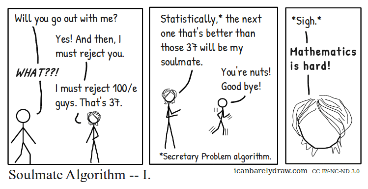Incluso esta simple regla la podemos aplicar al momento de buscar nuestra pareja, tanto para la cantidad de posibles parejas a analizar o el tiempo que pensamos que vamos a estar buscando una pareja.