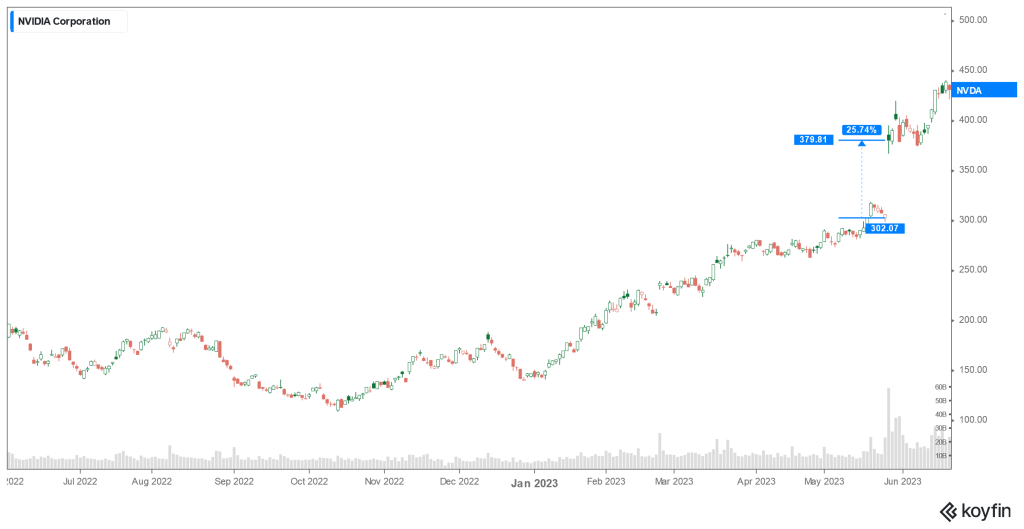 La razón de este salto? $NVDA indicó en su presentación de resultados que esperaba que en el Q2 de este año iban a tener ingresos por $11B. Entendible, ya que es una de las empresas más grandes e importantes de GPUs y data centers en el mundo. Pero, el pronóstico de crecimiento de ventas para el Q2 de todos los analistas de Wall Street era de $7.18B no $11B, un incremento de casi 53%. El pronóstico, según explicó el CEO de $NVDA Jensen Huang, se debe a que las computadoras requieren de mayor poder de procesamiento, más aún si se están implementando algoritmos avanzados, lo que significa más demanda por chips y GPUs. $NVDA está en una posición ventajosa para surfear la próxima ola de innovación en el mundo. Esta presentación desató el hype de la IA en todas las acciones del mercado, como bien dijo Kennedy: “A rising tide lifts all boats”.