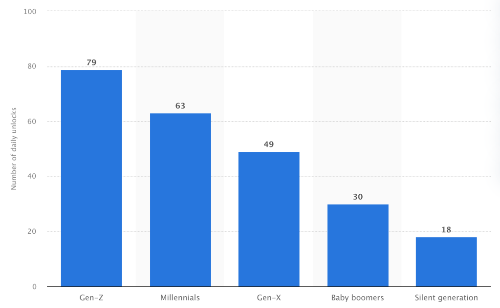 Average unlocks per day among smartphone users in the United States as of August 2018, by generation